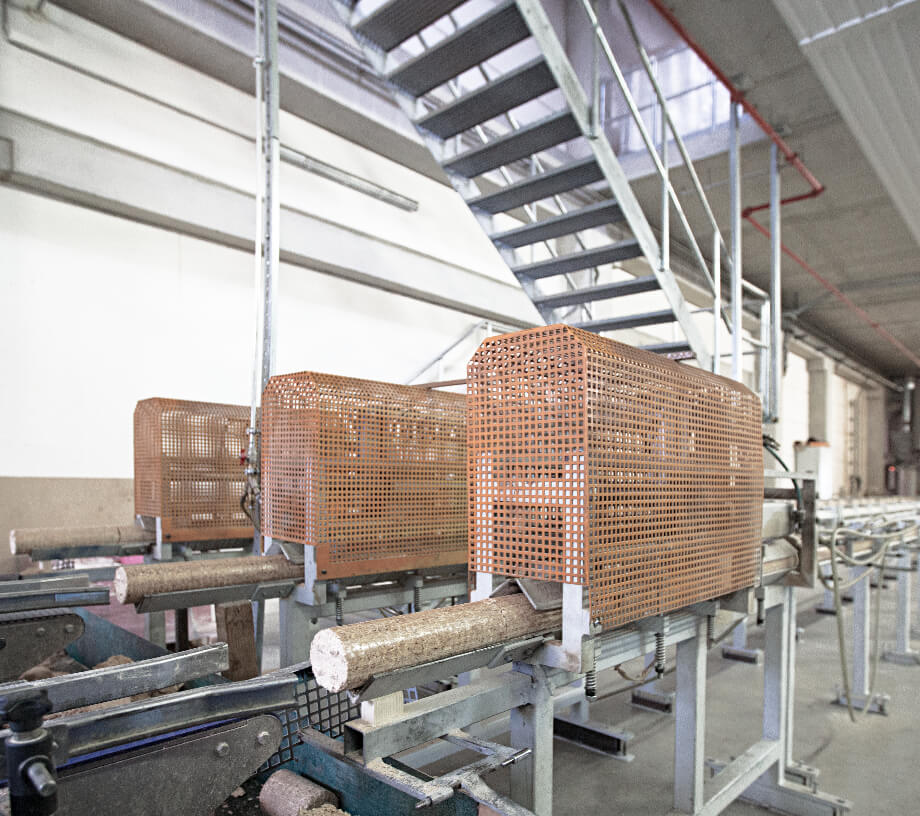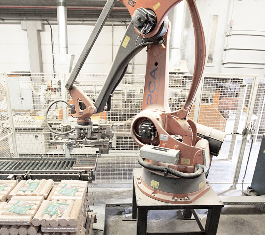 Alle anfallenden Reststoffe wie Späne und Sägemehl werden mit drei leistungsstarken, mechanischen Pressen zu hochwertigen Holzbriketts Premium verpresst, im Durchlauf verpackt und durch den Roboter versandfertig gestapelt. Damit wird das gesamte Restmaterial einer ökologischen Nutzung zugeführt.