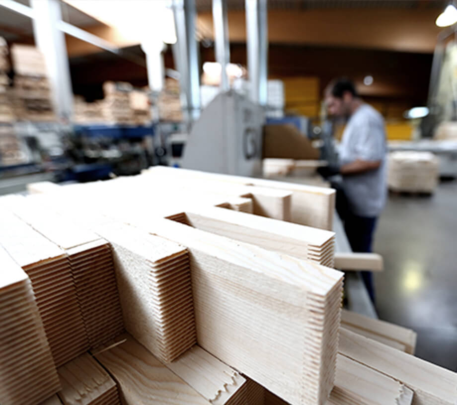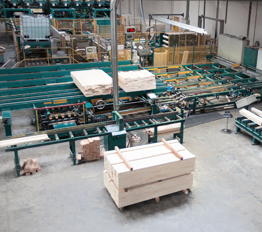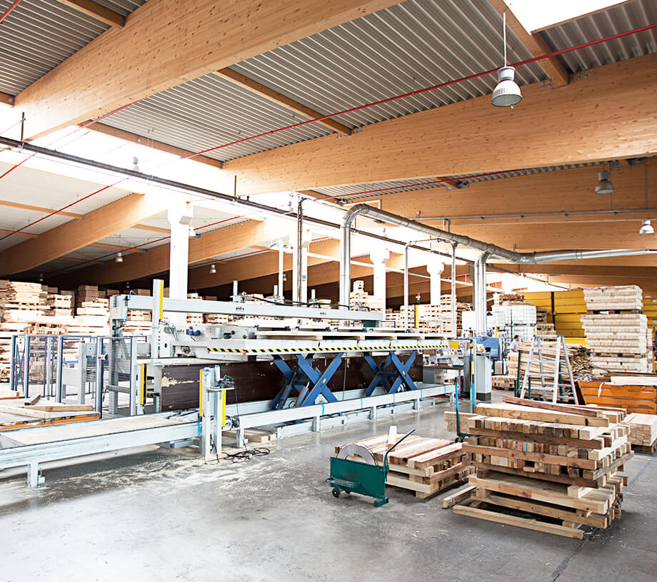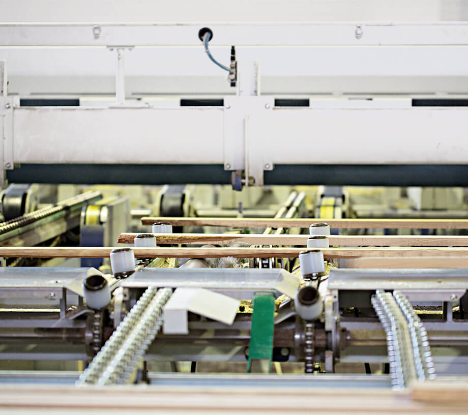Mit zwei hochmodernen Keilzinkanlagen mit je doppelten Frässtationen werden die anfallenden Kurzteile zu hochwertigen, fehlerfreien Keilzinklamellen für die Mittellage oder deckenden Anstrich verzinkt und damit die Verwertung des Rohstoffs Holz optimiert.