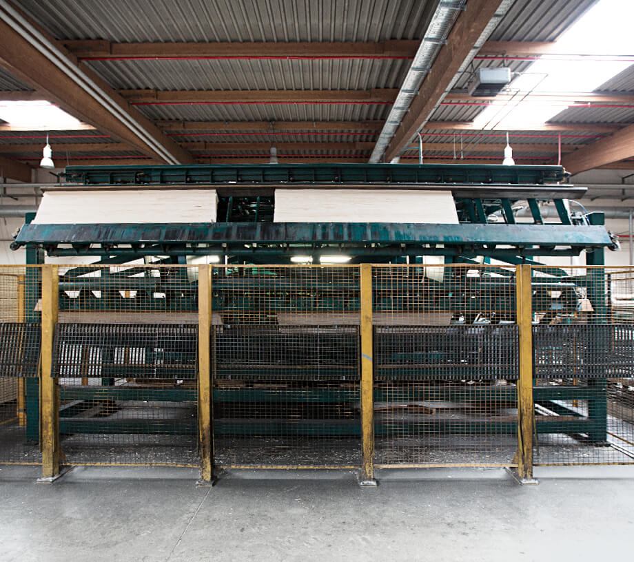Bewährte Blockpresswände bieten optimale Möglichkeiten bezüglich Dimension und Kantelaufbau. Die Kapazität der Anlage wird durch die 32 m lange Blockwand definiert. Dabei werden unterschiedliche Leimsysteme eingesetzt.
